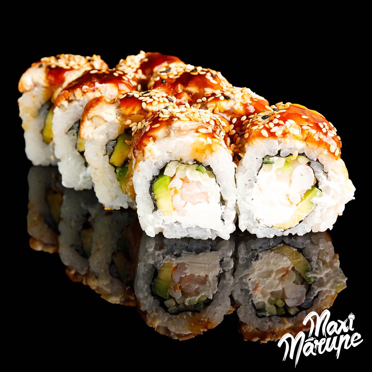 Avokado, Garneles, Gurķis, Krēmsiers, Massago ikri, Rīsi, Teryaki mērce, Zutis