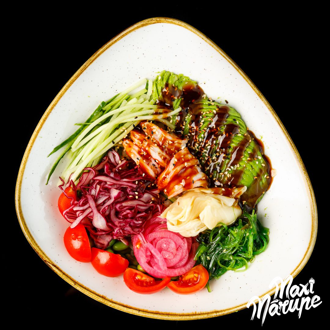 Avokado, Cherry tomāti, Garneles, Gurķis, Rīsi, Sezama sēklas, Sojas mērce, Sojas pupiņas, Wakame salāti